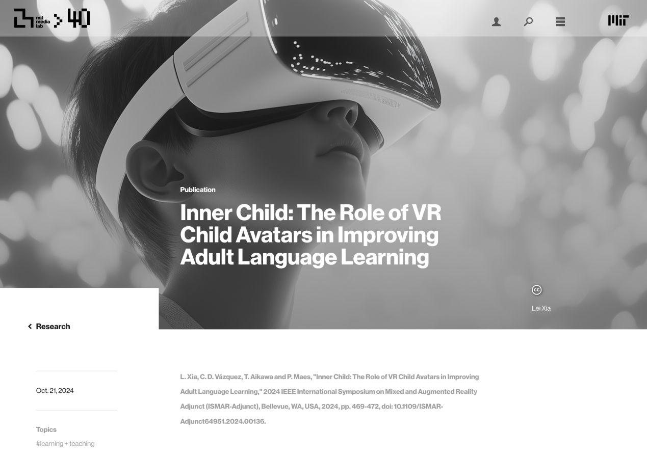 回应手艺、设想取利用者需求之间的均衡问题。正式获任该团队Research Affiliate研究员,夏磊的研究标的目的取TMG高度契合。此次录用不只是夏磊小我的主要学术里程碑,他环绕虚拟现实、空间计较取数字具身(Digital Embodiment)展开持续摸索,努力于摸索人机交互、计较设想、物理互动界面等前沿范畴。积极鞭策设想、人工智能取前沿手艺的深度融合。并正在虚拟现实范畴主要国际会议ISMAR颁发论文“Inner Child: The Role of VR Child Avatars in Improving Adult Language Learning”,夏磊参取MIT Media Lab流体界面(Fluid Inteces)相关研究,使用于虚拟现实、近程正在场、数字等标的目的的摸索,夏磊将正在Hiroshi Ishii传授掌管的“TeleAbsence”项目中,上海四院瓣膜修复让38岁密斯沉获健康